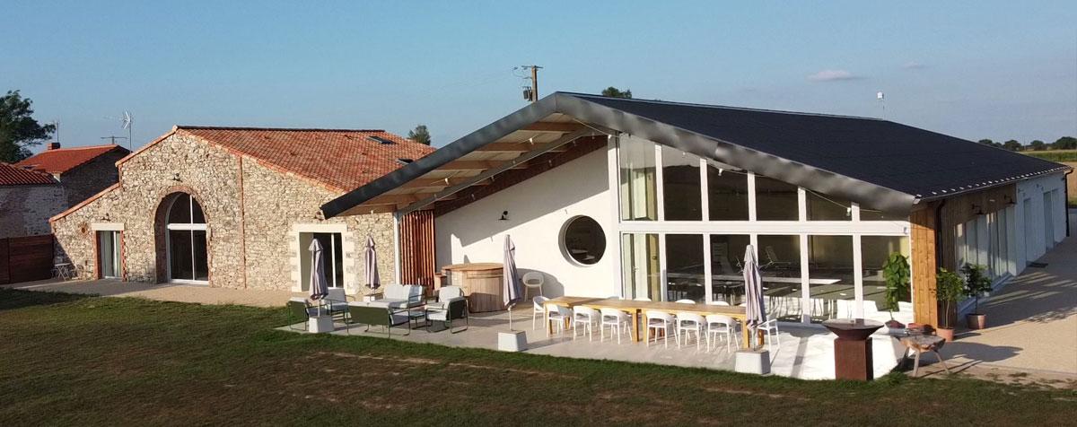 Le Domaine Quatre Plumes est le résultat d'une réhabilitation d’une grange et d'un bâtiment agricole en salle de réception (50-200 pers) avec un grand gite pouvant accueillir 15 personnes et un espace détente lumineux et ouvert sur la nature comprenant une piscine et spa.